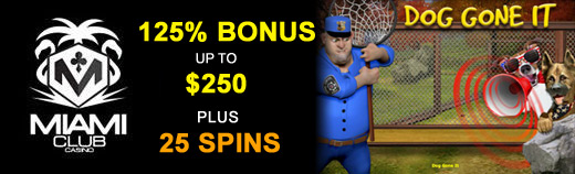 - 125% bonus up to $250 PLUS 25 spins on Dog Gone It!